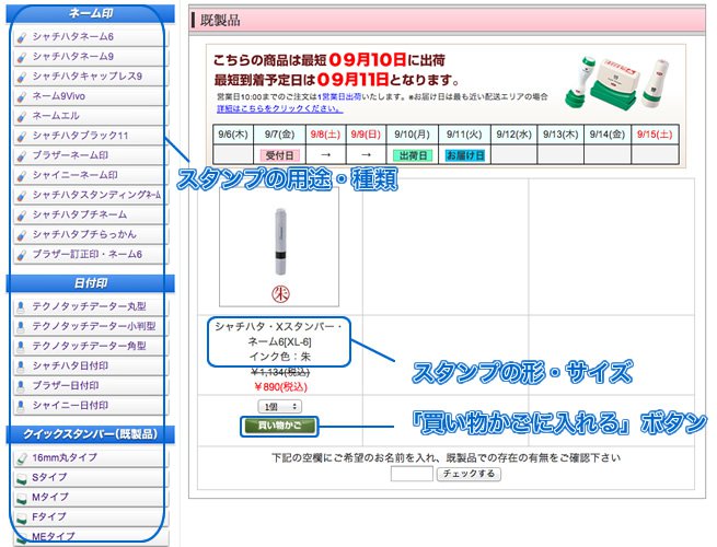 スタンプの用途や形、サイズでお望みのスタンプを選び「買い物かご」ボタンを押して下さい。