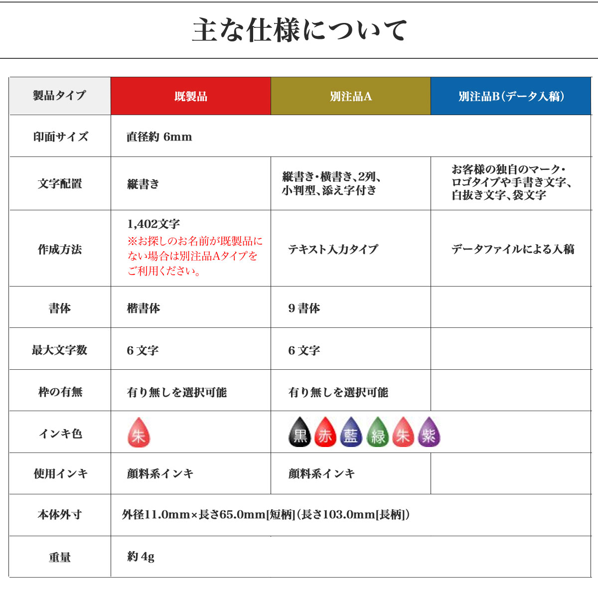 | 文字配置 | 縦書き | 縦書き・横書き、2列、小判型、添え字付き | お客様の独自のマーク・ロゴタイプや手書き文字、白抜き文字、袋文字 |