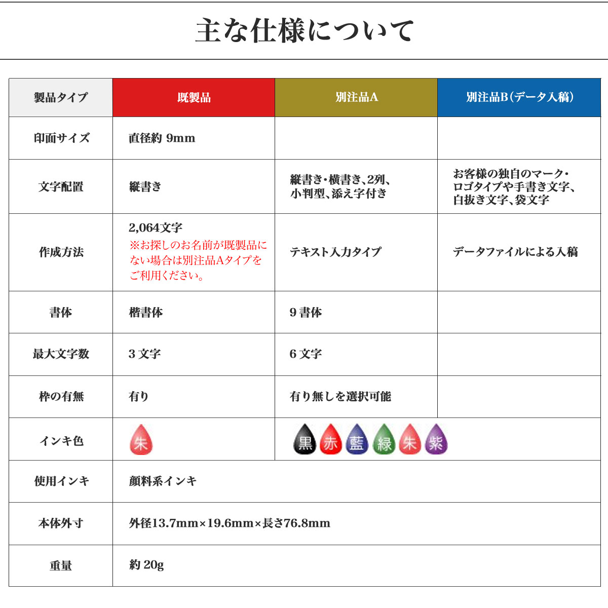 | 文字配置 | 縦書き | 縦書き・横書き、2列、小判型、添え字付き | お客様の独自のマーク・ロゴタイプや手書き文字、白抜き文字、袋文字 |