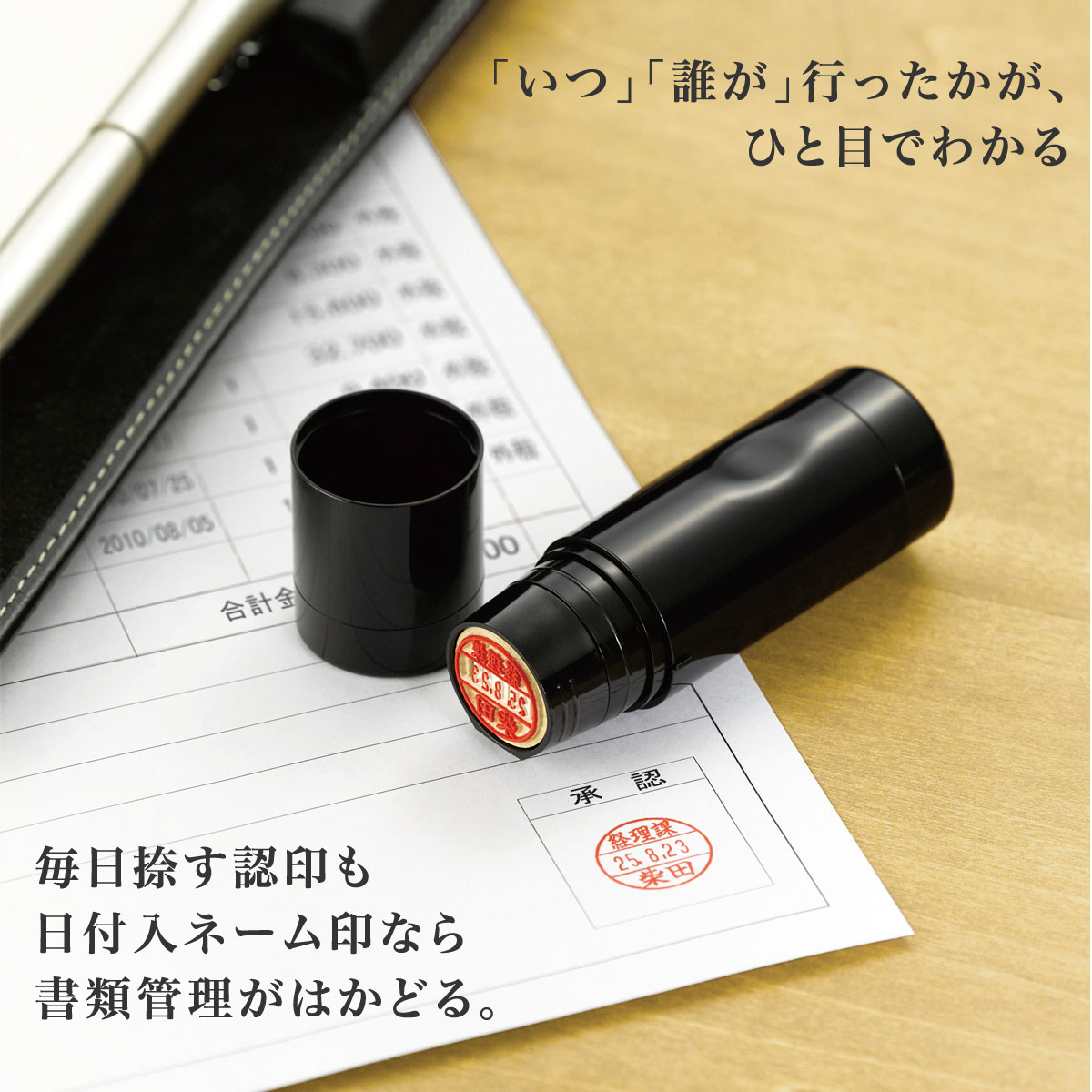 書類整理がはかどる日付入りのネーム印です。氏名と日付を同時に捺印できるので書類作業の管理に最適。簡単な日付変更機能やインク充填機能、正確な印字を補助する機能など多彩な機能と、事務用パターンの印面も合わせてさまざまなビジネスシーンで活躍できる商品となっております。
