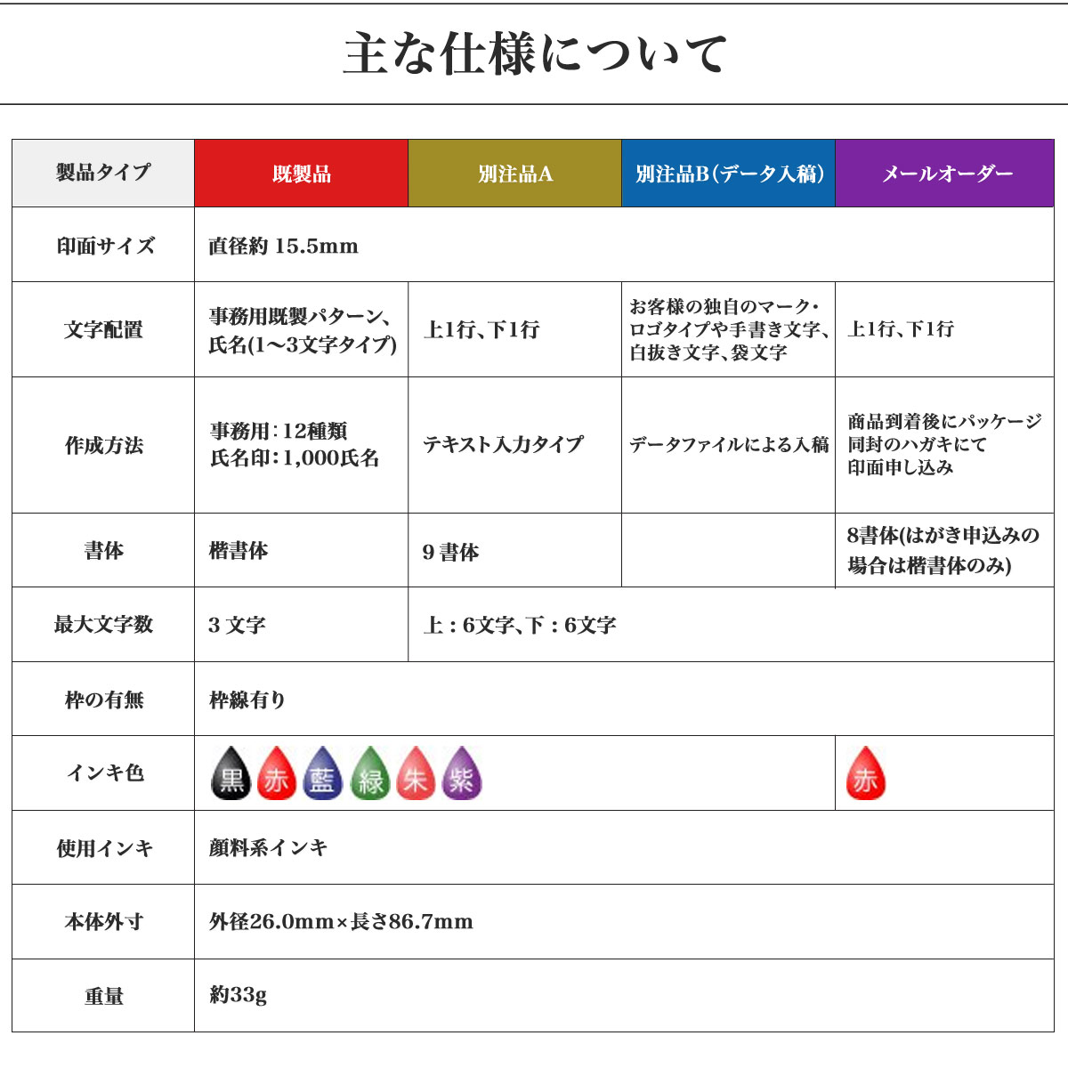 | 文字配置 | 事務用既製パターン、氏名(1〜3文字タイプ) | 上1行、下1行 | お客様の独自のマーク・ロゴタイプや手書き文字、白抜き文字、袋文字 | 上1行、下1行 |