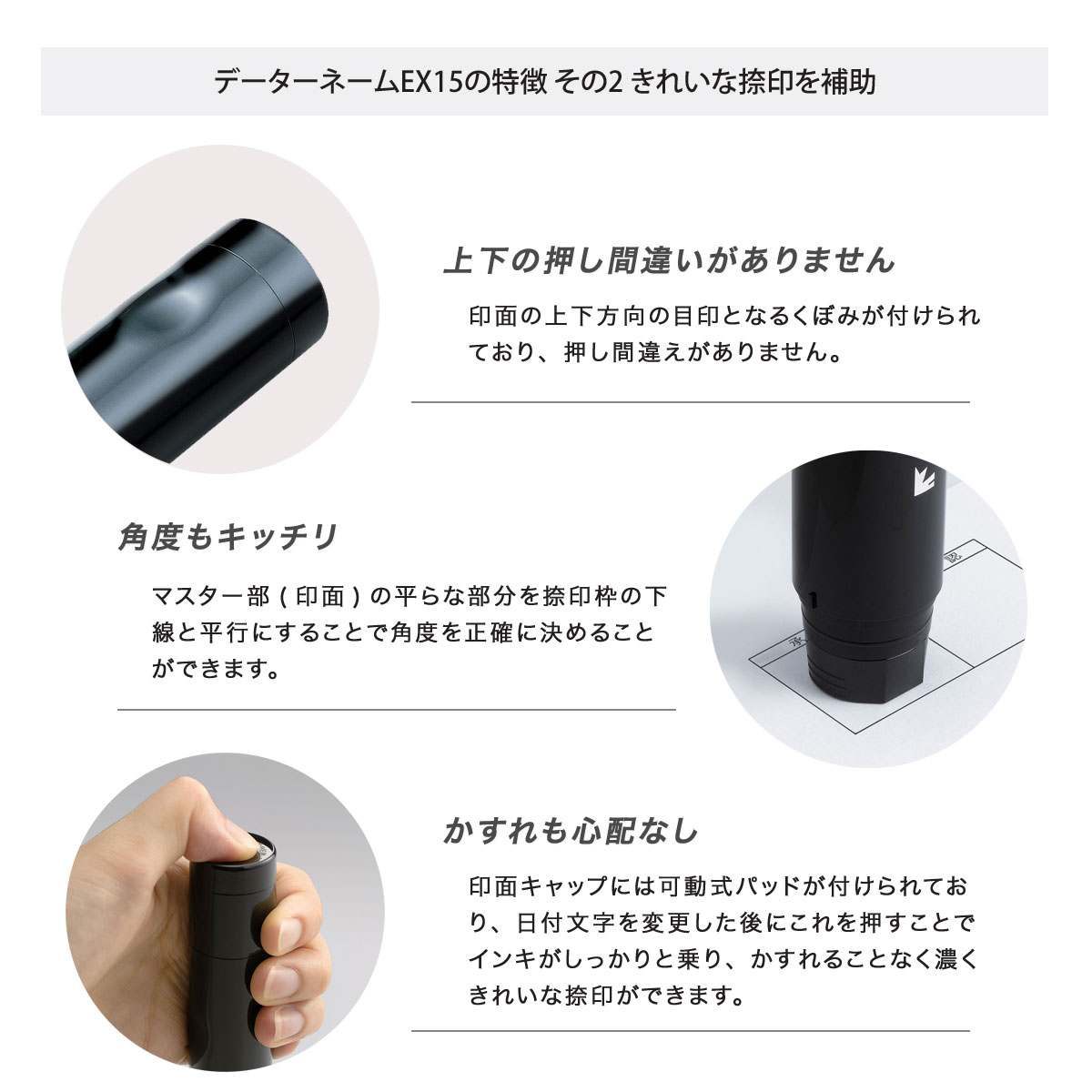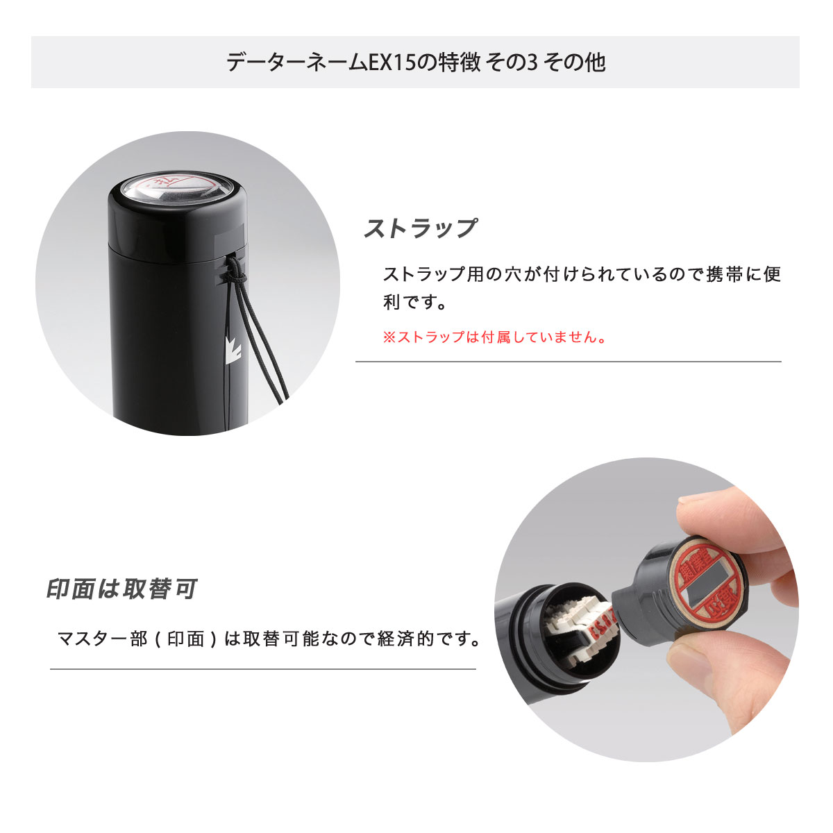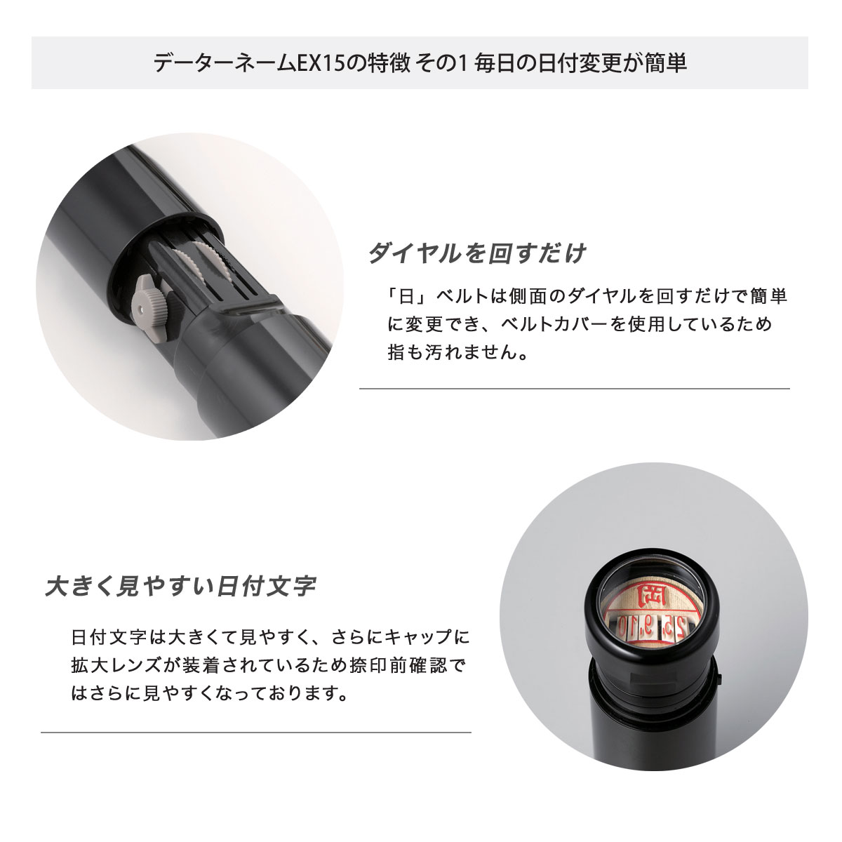 | 商品名称 | シャチハタ/日付入ネーム印/データネームEX 15号 キャップ式/既製品/本体+マスター部(印面)セット/インキ色 : 6色から選択可能 |