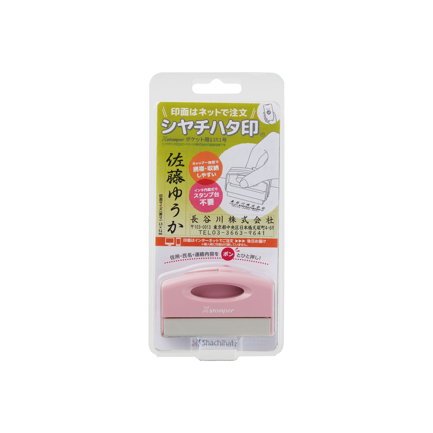 シャチハタ/Xスタンパー/ポケット用1351号/印面13×51mm/ピンク(メールオーダー/商品到着後印面申込)/インク色:6色から選択可/Shachihata/Xstamper/PXCP-1BN/MO/コード:39808