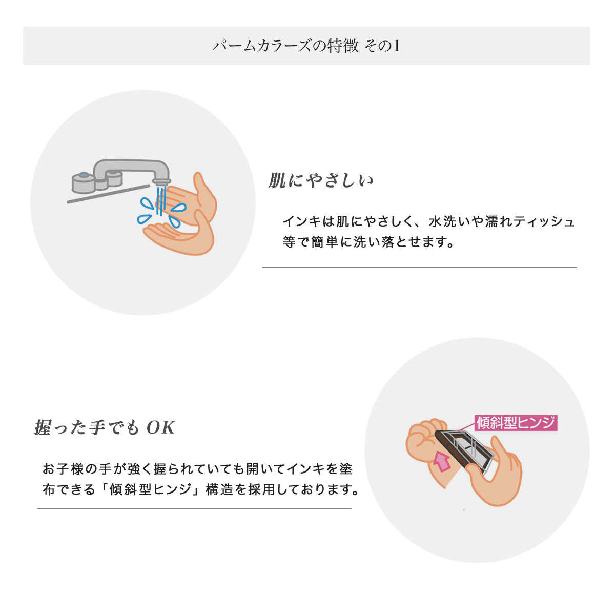 お子様の手が強く握られていても開いてインキを塗布できる「傾斜型ヒンジ」構造を採用しております。