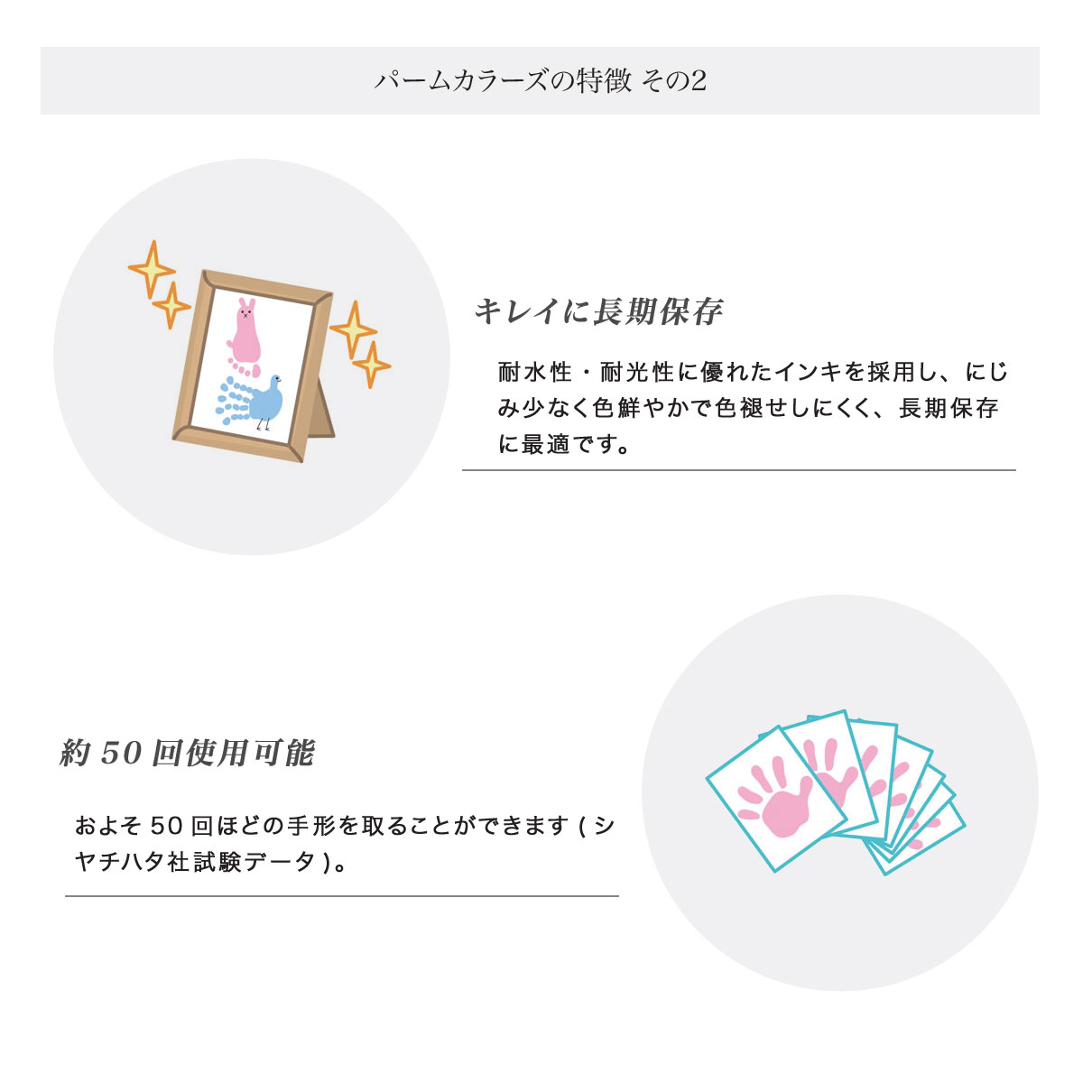 シャチハタ「PalmColors パームカラーズ」はお子様の手形・足形を色鮮やかに残せるスタンプパッドです。