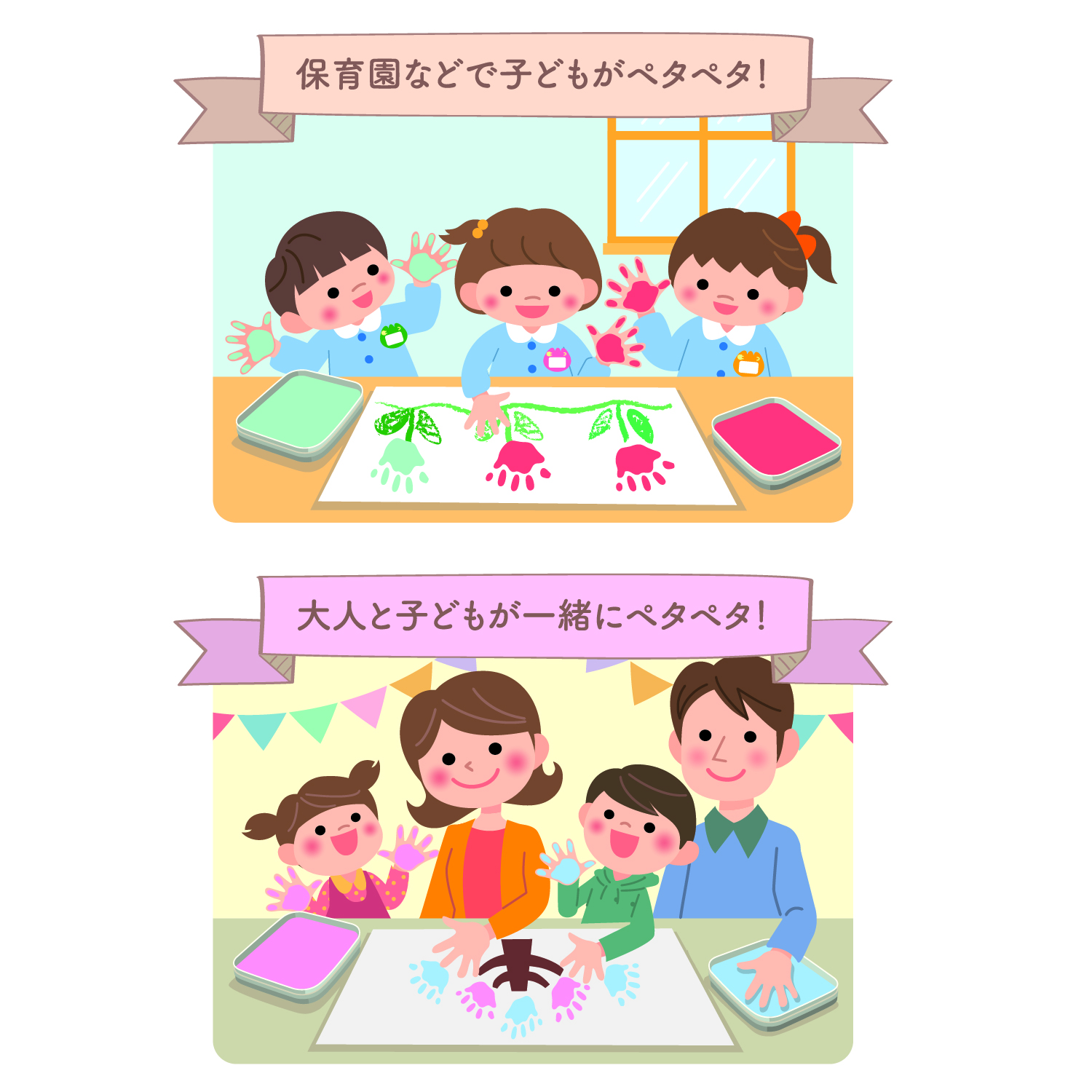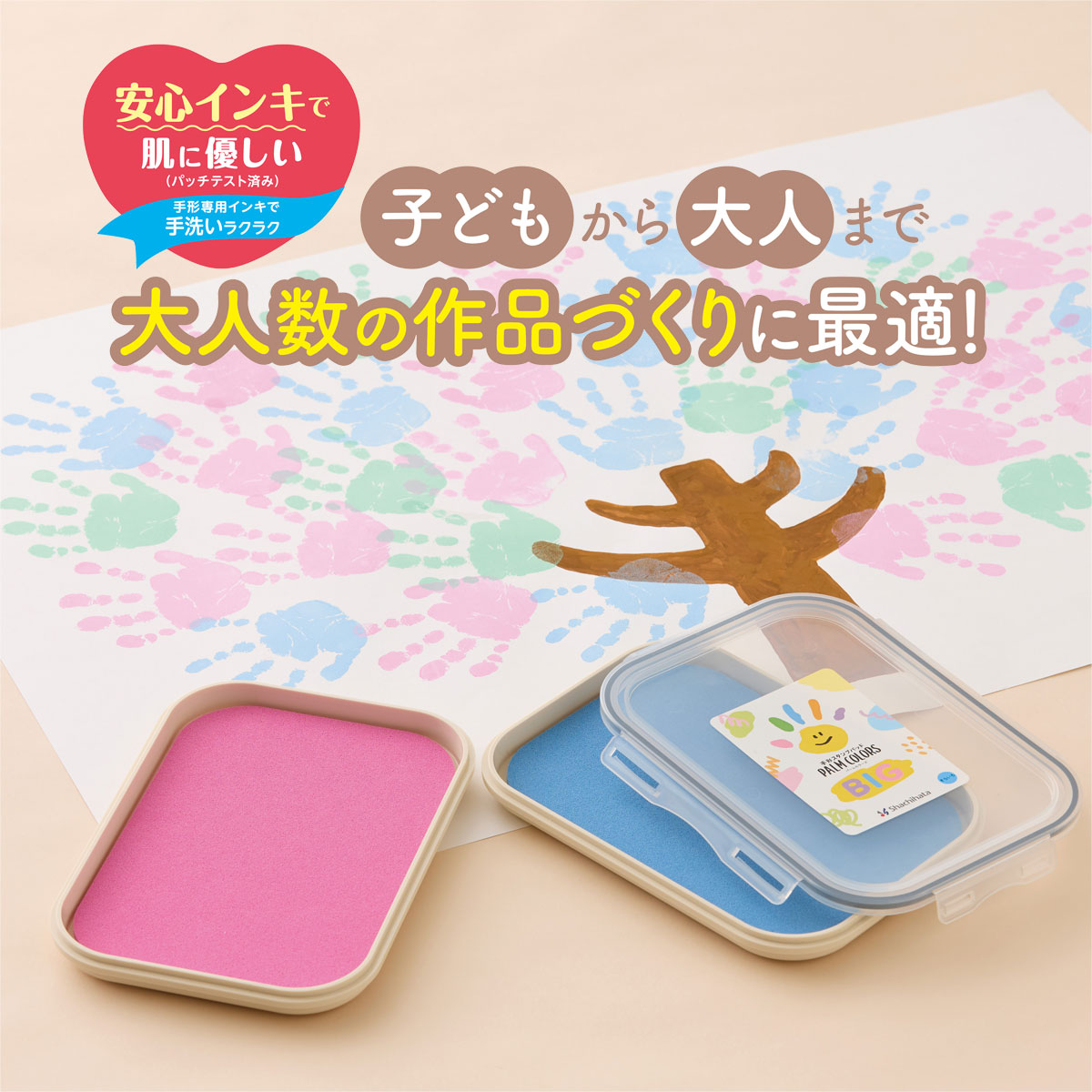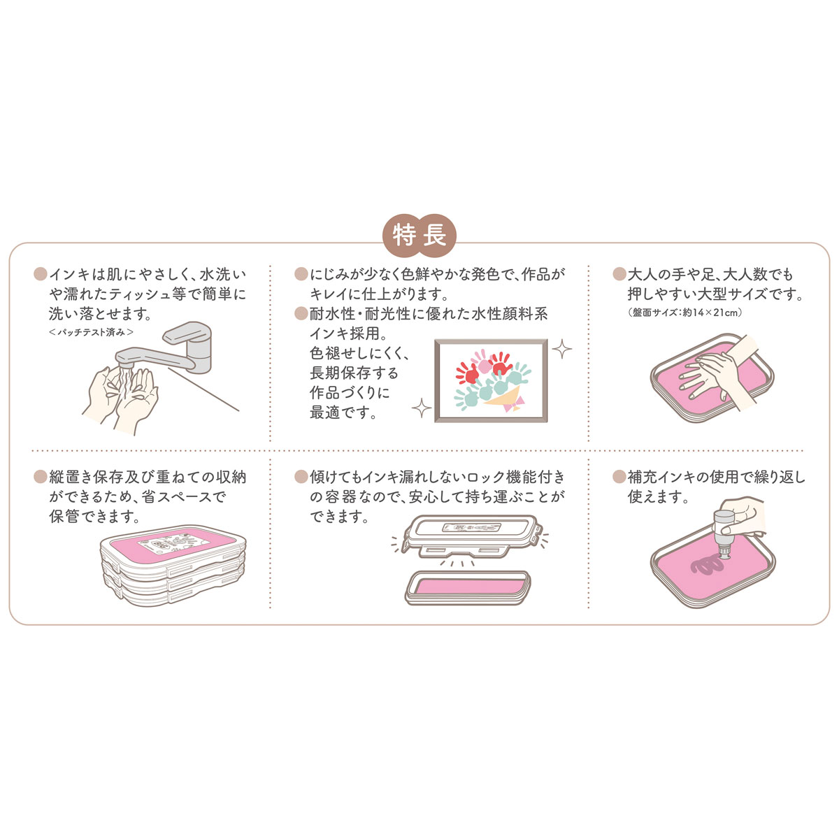 | インキは肌にやさしく、水洗いや濡れたティッシュ等で簡単に洗い落とせます(パッチテスト済)。 | にじみが少なく色鮮やかな発色で、作品がキレイに仕上がります。また、耐水性・耐光性に優れた水性顔料インキの採用により、色褪せしにくく長期保存する作品づくりに最適です。 |
