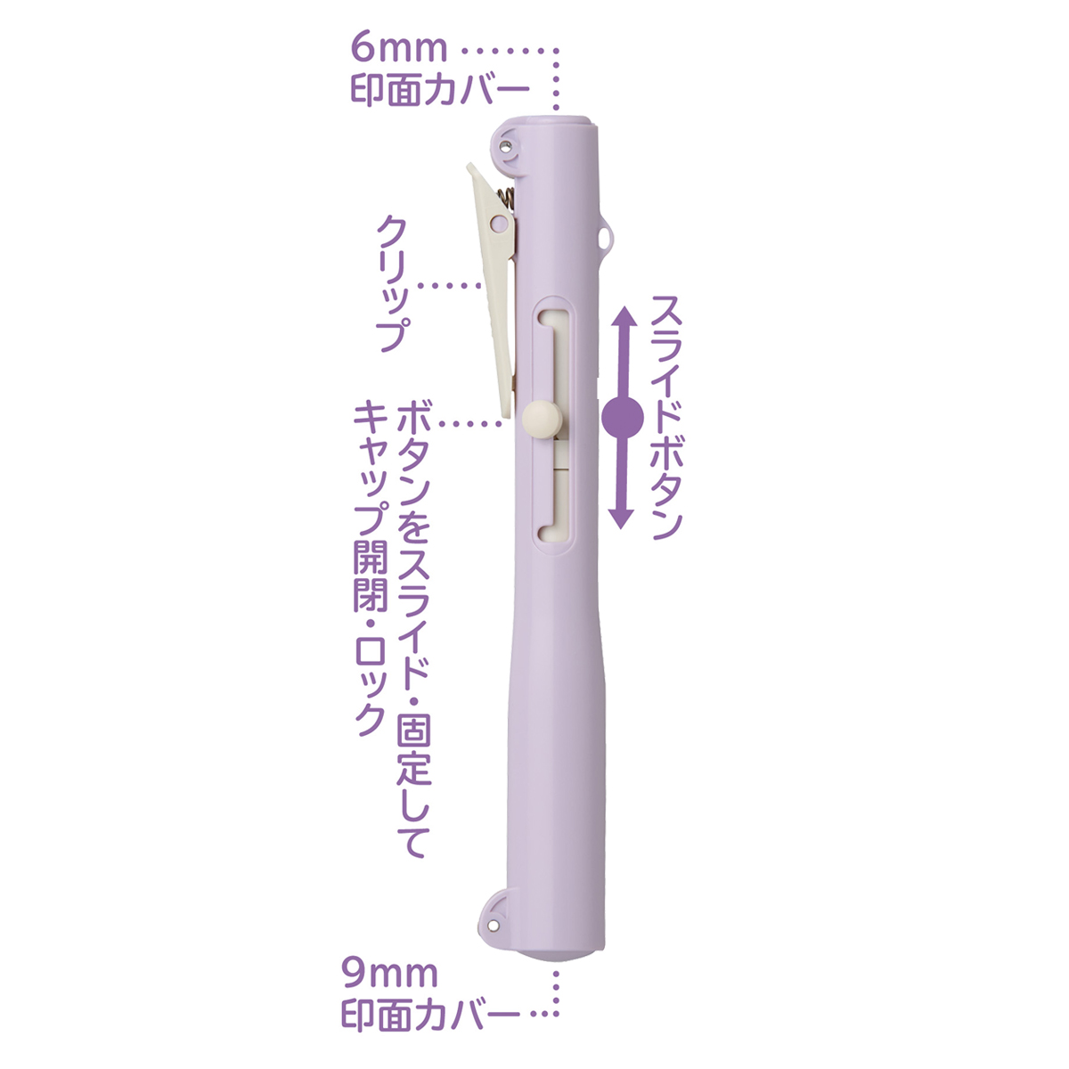 | 「片手でなつ印作業を行いたい」というユーザーの要望に応え、キャップの開閉ロックには片手で手軽に扱えるスライドボタン方式を採用。 | ポケットに収納しても取り出しやすいロングタイプのペン型デザイン。厚手の資料なども素早く挟める便利なバインダークリップが付いています。 |