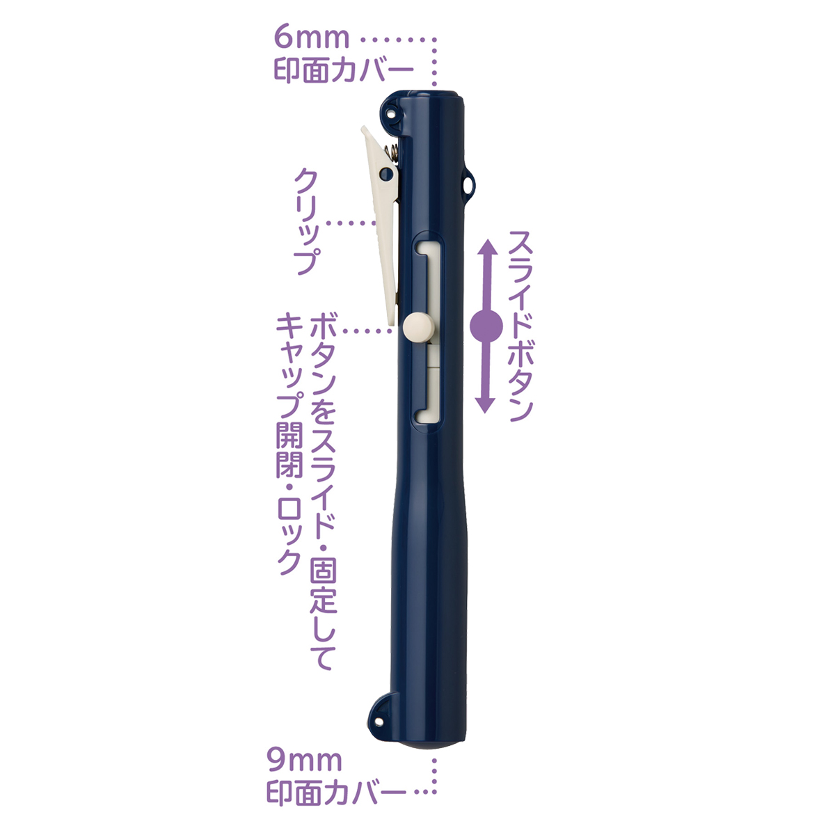 | 「片手でなつ印作業を行いたい」というユーザーの要望に応え、キャップの開閉ロックには片手で手軽に扱えるスライドボタン方式を採用。 | ポケットに収納しても取り出しやすいロングタイプのペン型デザイン。厚手の資料なども素早く挟める便利なバインダークリップが付いています。 |