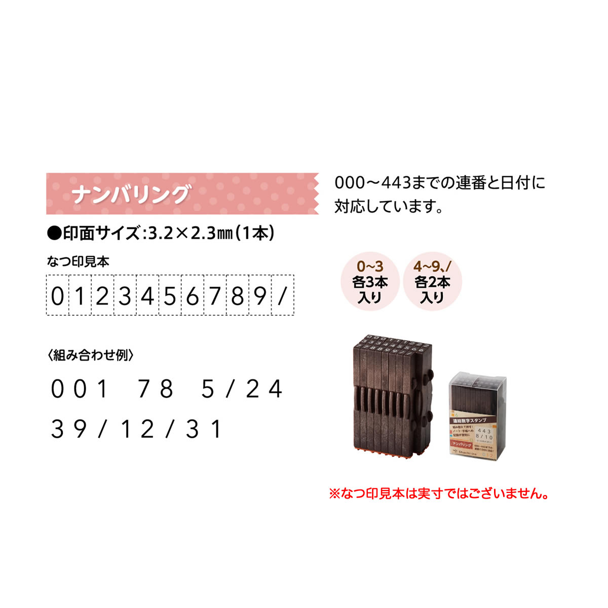 000〜443の連番と日付に対応したスタンプです。記号の単品も合わせご使用いただくとさらに多彩なパターンを作成できます。