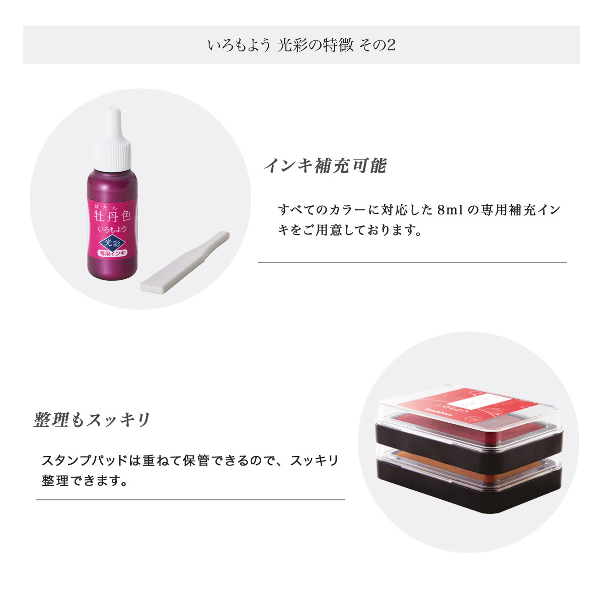 日本の伝統色を取り入れたスタンプ台、「いろもよう」シリーズからほんのりキラめくインキを採用した「いろもよう 光彩」が新登場。