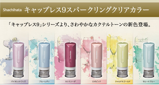 ワンタッチで捺印できるネーム印・キャップレス9にさわやかなカクテルトーンの新色が登場しました。捺印時にシャッターが自動的に開くウィングシャッター機構を採用。携帯時に安心なロック付きで、片手で簡単に操作できます。ストラップ用の紐を通す穴もついています。