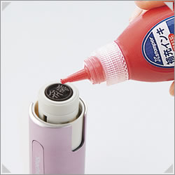 ホルダーキャップとインキ補充口キャップを外して、補充口から中のインキ吸蔵体にインキが吸い込まれるのを確認しながら、ゆっくりと補充してください。