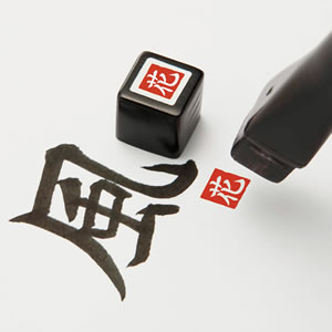本格派毛筆タッチの筆ペンと美しい漢字一文字のスタンプがひとつになったはんこ付筆ペンです。「美」「夢」「愛」など訪日外国人が好きな漢字10種類の既製品と、メールで印面を自由にお申込みいただけるメールオーダー品を用意しました。絵はがきやスケッチ、金封・のし紙の表書きなどにご使用いただけます。日本らしい伝統と技術を感じられる商品でもあり、海外から来られたお客様へのお土産にお勧めです。