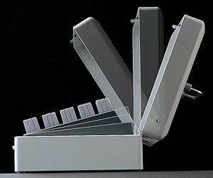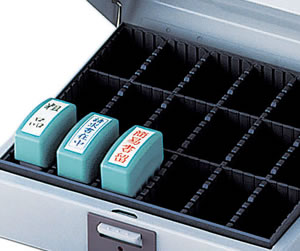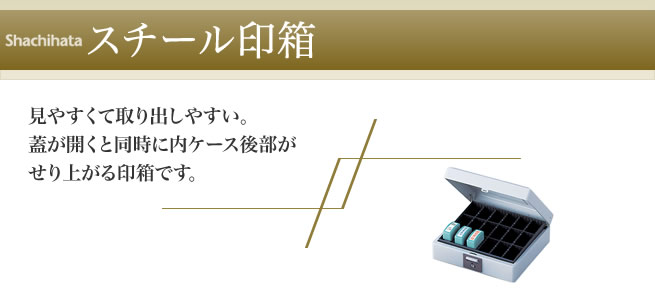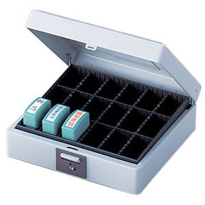 ワンタッチオープン式の蓋はロックの開閉状態がひと目でわかる表示窓付きで、蓋が開くと内ケース後部がせり上がり見やすく、スタンプを取り出しやすくなっています。