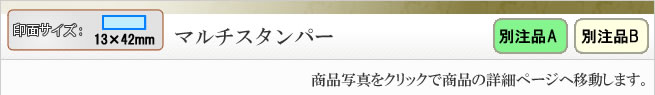 13×27mm〜20×60mmまでの、短辺が13〜20mmの中型の長方形型印面のスタンプのラインナップです。書類や封筒のコメント表示に便利なビジネス用A型・B型、印面を切り替えられるマルチスタンパー、ケースの中に収まって携帯に便利なポケット用スタンプなど13種類をご用意しています。
