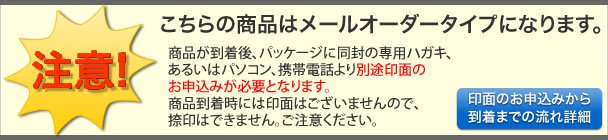 商品到着後、商品同梱の専用ハガキかインターネットで印面を別途申込むメールオーダータイプの商品と、印面のデータを入稿いただき作成する別注品がございます。メールオーダータイプは印面代金・印面送料は商品代金に含まれておりますので贈り物にも最適です。